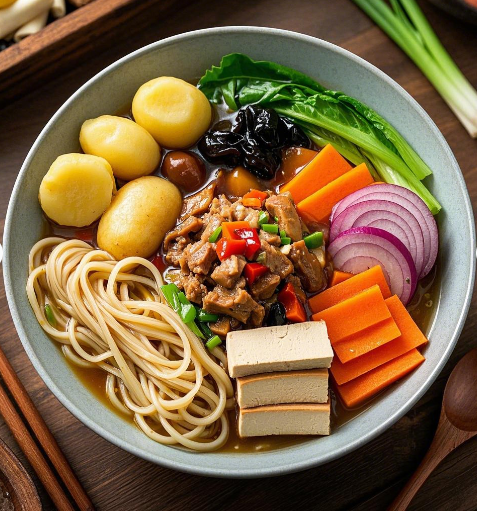 面条、猪肉、胡萝卜、土豆、莴苣、豆腐干、木耳、黄花菜、洋葱、生抽2勺,老抽半勺,蚝油1勺,清水或者高汤,葱姜蒜适量,盐、高正茶油适量